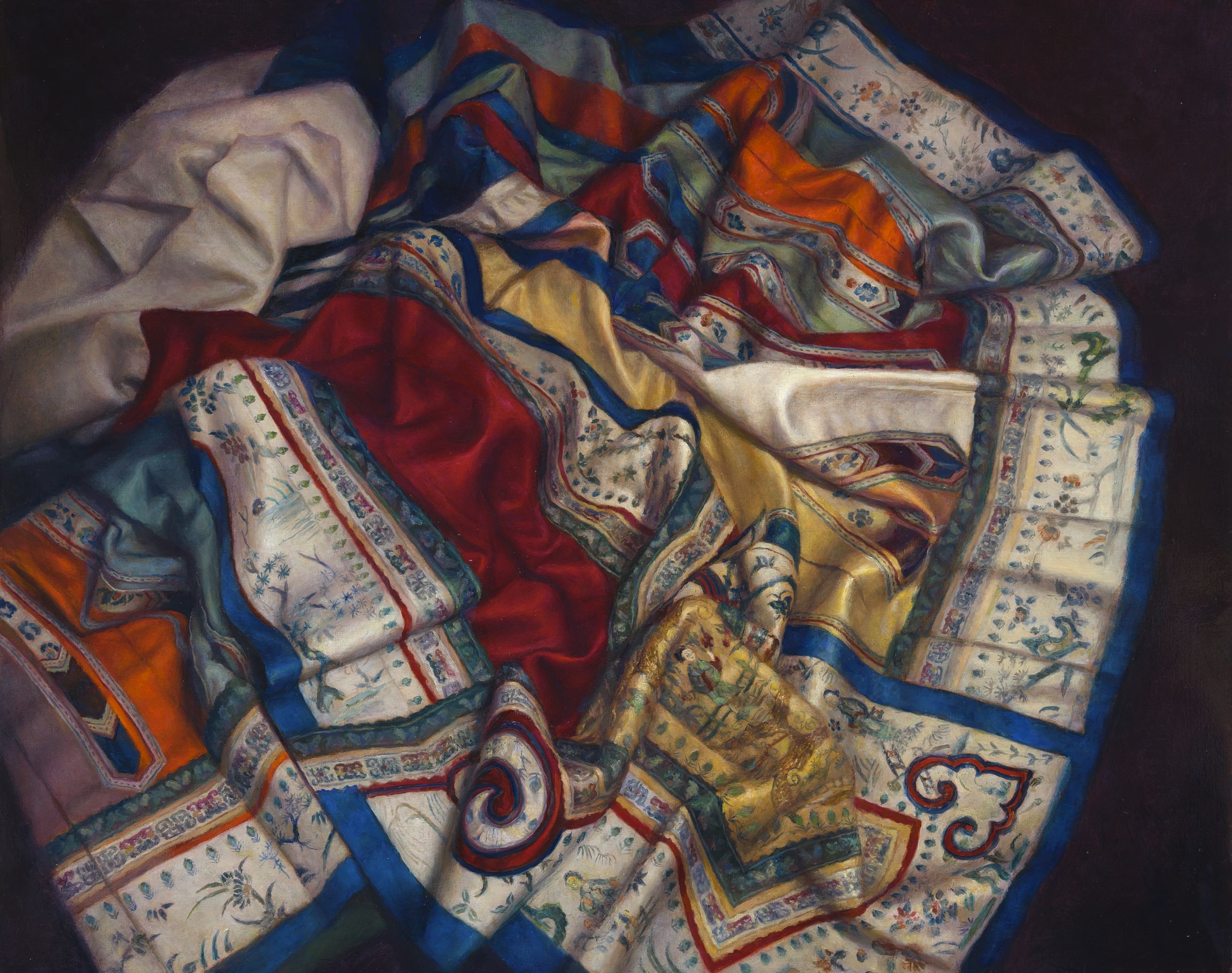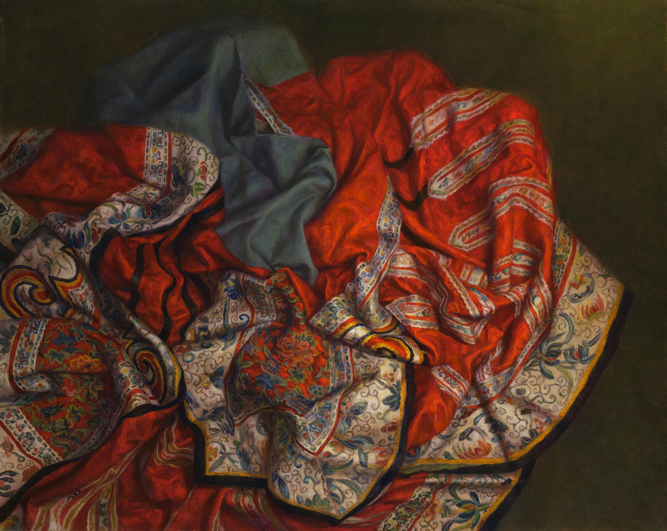 展覽引言由國內知名美術學者黃冬富教授撰寫。他指出,兩位藝術家雖風格迥異,卻同樣深具東方文化底蘊。梁永斐以書法筆意轉化為抽象畫境,於宣紙間揮灑出文人氣度與靈思意象;陳香伶則以清代刺繡為創作載體,結合寫實油畫技巧,細膩詮釋台灣女性在傳統與現代間的情感糾結。兩人作品皆呈現「東西融合、異中求和」的精神,相互輝映、各展風采。