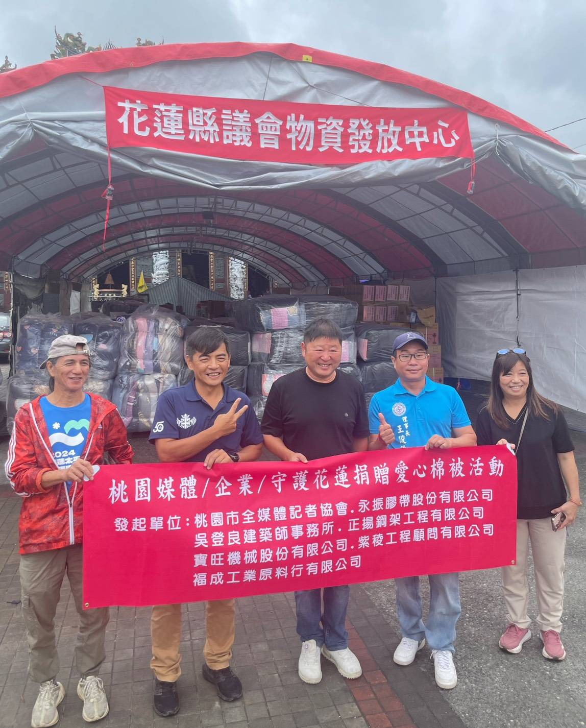 面對花蓮震災後的嚴峻挑戰,桃園市全媒體記者協會秉持「新聞有溫度、媒體有愛心」的初衷,號召桃園地區企業共同響應「用愛心守護花蓮」捐贈行動。此次由永振膠帶股份有限公司、吳登良建築師事務所、正揚鋼架工程有限公司、寶旺機械股份有限公司、紫稜工程顧問有限公司及褔成工業原料行有限公司等六家企業熱心支持,並結合國際獅子會300B5區2023創區總監翁明哲、平鎮區議員參選人彭柏霖、2024總監鄒秀鳳與近50位獅友,共同捐贈1000套愛心棉被送至花蓮災區,為受災民眾注入溫暖力量。花蓮縣原漾藝文發展協會亦同步捐贈善款,共同響應這場愛的行動。