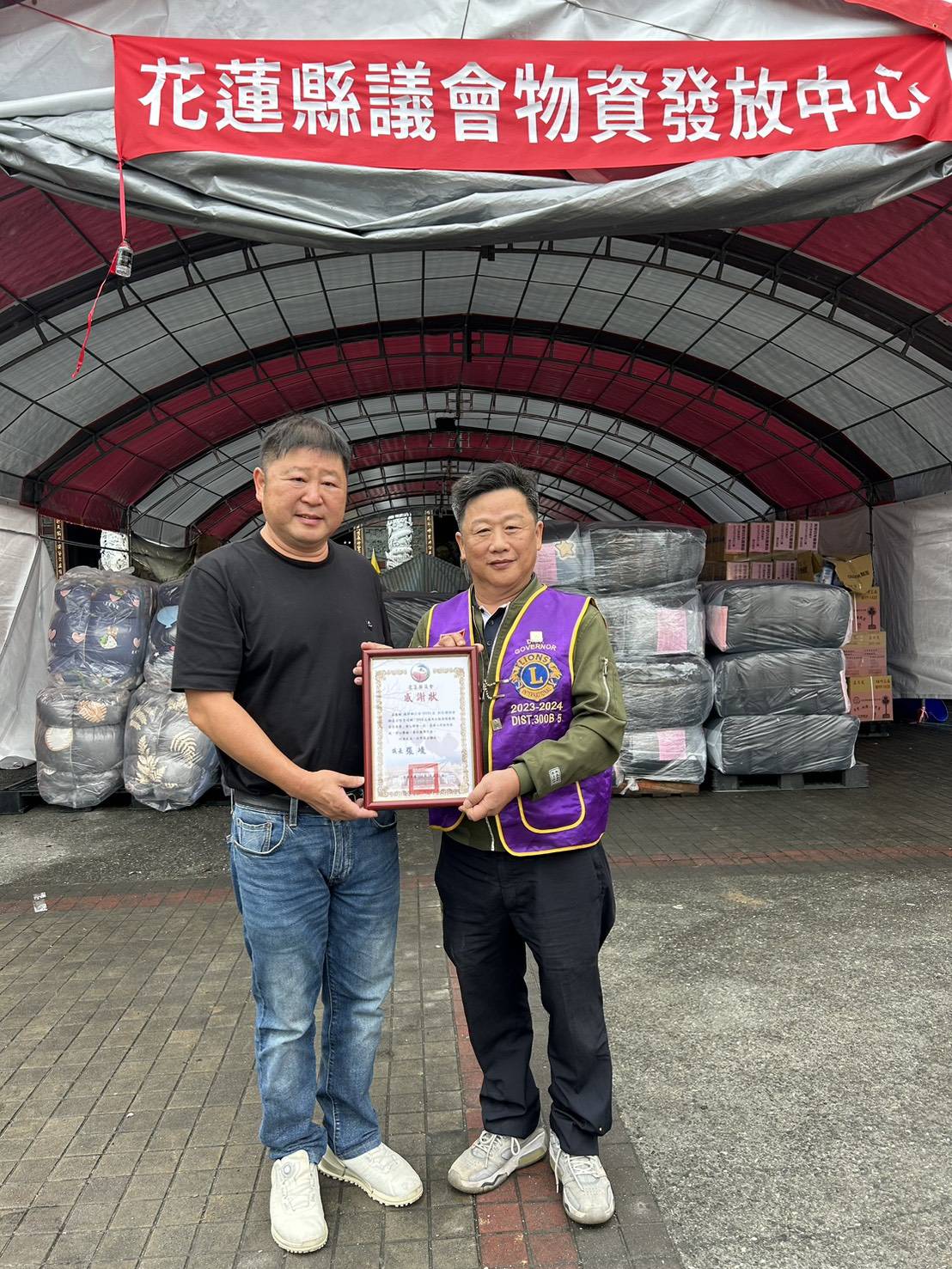 花蓮縣議會議長張峻代表花蓮縣議會頒發感謝狀給獅子會300-B5幹部代表