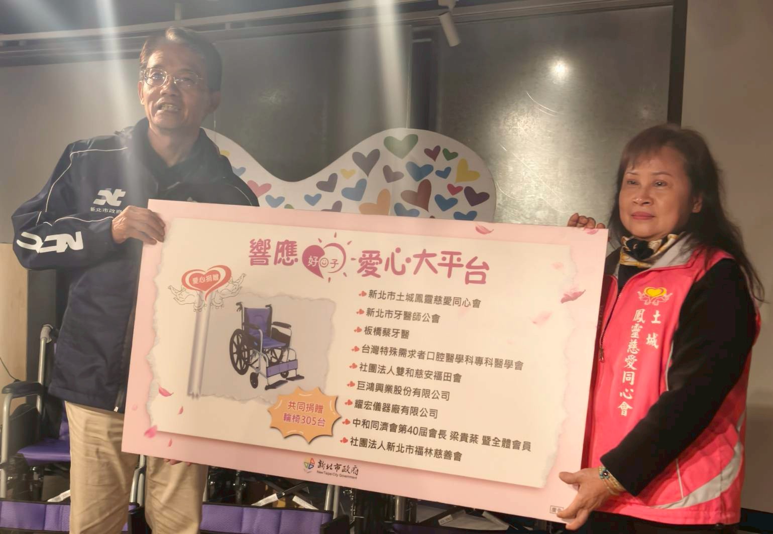 新北土城鳳靈慈愛同心會等單位自民國108年至113年6月止,已累計捐贈輪椅1,188台、助行器245台及氧氣製造機1台,持續為弱勢族群注入溫暖。本次捐贈之305台輪椅,由新北市秘書長邱敬斌代表受贈並頒發感謝獎牌,所有輔具將交由新北市輔具資源中心評估後,免費媒合給有需求的民眾,讓善心物資發揮最大效益,促成資源共享、愛心循環。