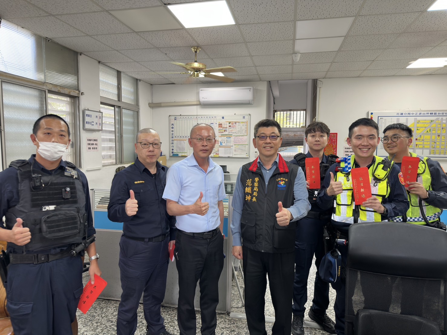 2月16日除夕下午,花蓮縣警察局局長范織坤特別前往花蓮市區金三角路段,親自向春節期間堅守崗位的花蓮分局同仁致贈紅包慰勉,感謝同仁犧牲與家人團聚時光,守護市民安全,讓執勤的同仁也能感到溫馨氛圍。