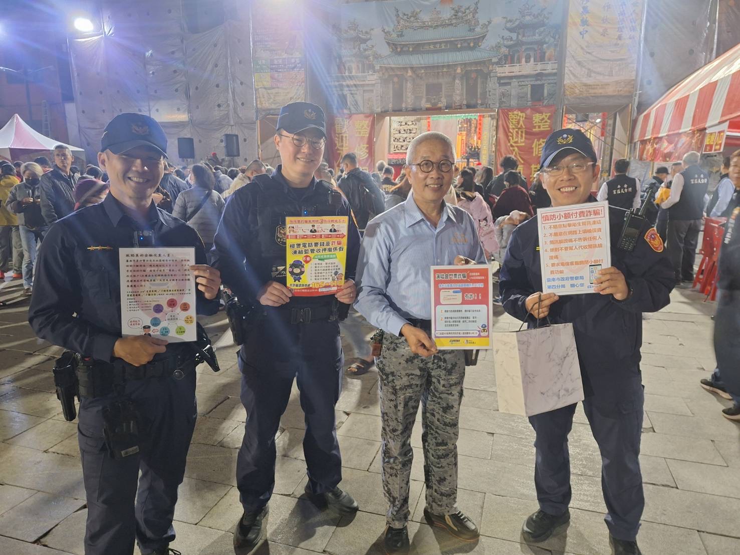 臺南市政府警察局守護治安不打烊,為確保春節期間治安平穩、交通順暢,使民眾能安心過節,第四分局特別於除夕夜結合民政局及安平區公所,與在地義警民防共同前進安平信仰中心「安平開台天后宮」,利用新春開廟門團拜民眾等候時舉行「115年加強重要節日安全維護工作」宣導活動,與在地鄉親近距離互動,並針對節間龐大的金流處所強化巡守,務求讓每位市民都能在安全無虞的環境下歡度佳節。