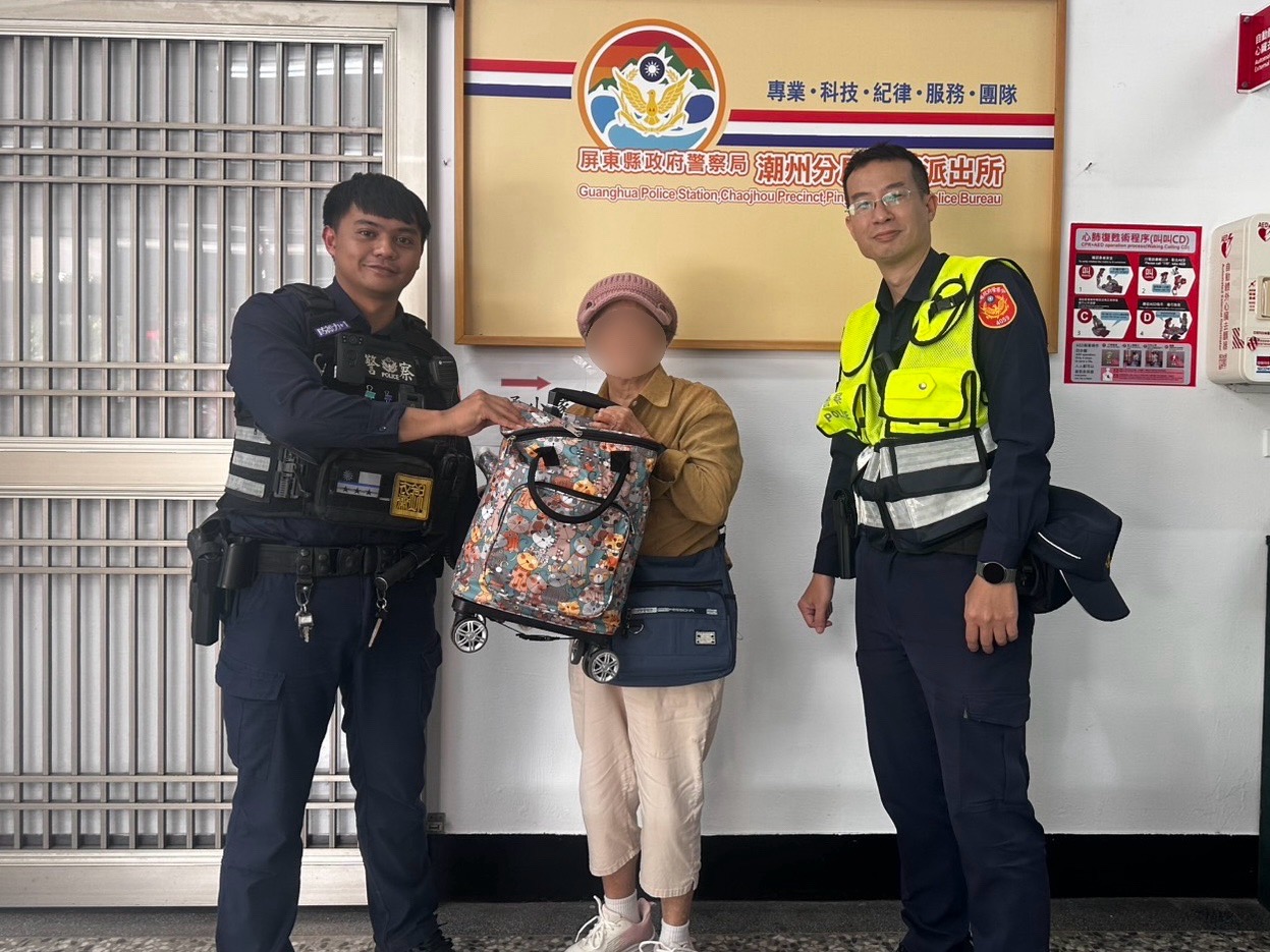 潮州分局光華派出所副所長何泓駒、警員江承恩獲報後,立即趕赴現場協助處理。經了解,77歲詹姓婦人與友人自中部南下潮州走春,搭乘計程車抵達園區後,不慎將隨身行李遺落車內。員警隨即調閱周邊監視器影像,迅速確認計程車車牌號碼並聯繫司機,順利尋回遺失行李,化解一場虛驚。